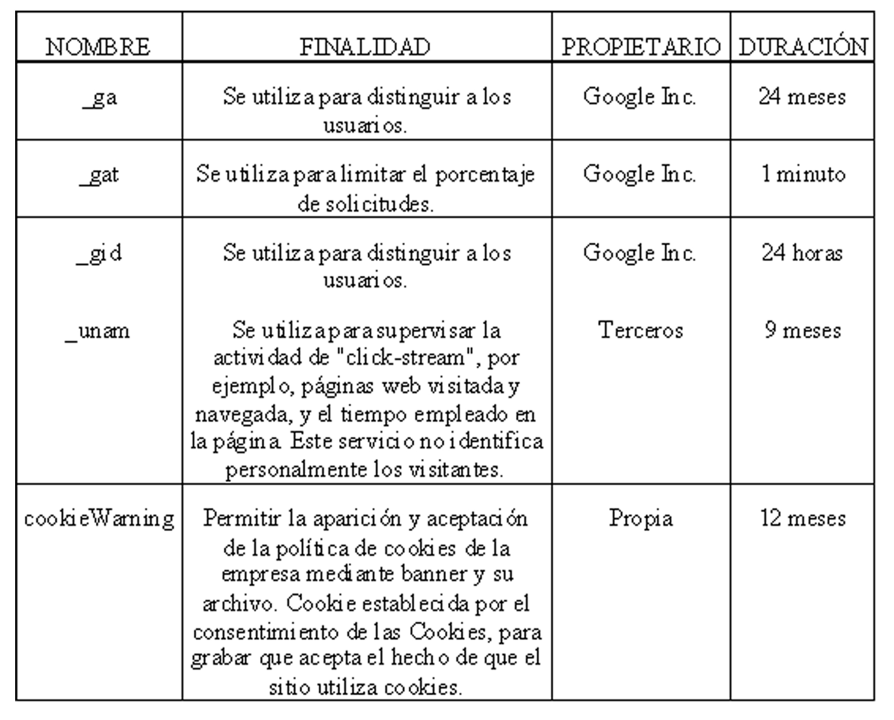 En el siguiente cuadro le indicamos que cookies empleamos en este sitio web junto con la finalidad de las mismas, su duración e información sobre si es propia o de un tercer: